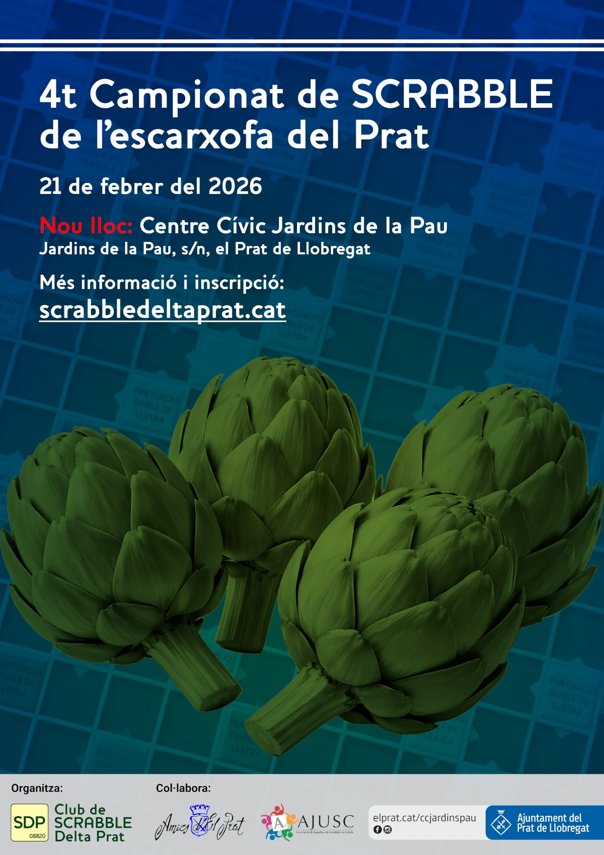 El dissabte 21 de febrer del 2026 celebrarem el 4t Campionat de Scrabble de l’escarxofa del Prat en un nou emplaçament: el Centre Cívic Jardins de la Pau (Jardins de la Pau, s/n, del Prat de Llobregat). El campionat es jugarà a 6 rondes, d’un contra un, amb sistema suís i amb rellotges d’escacs programats a 25 minuts per jugador.